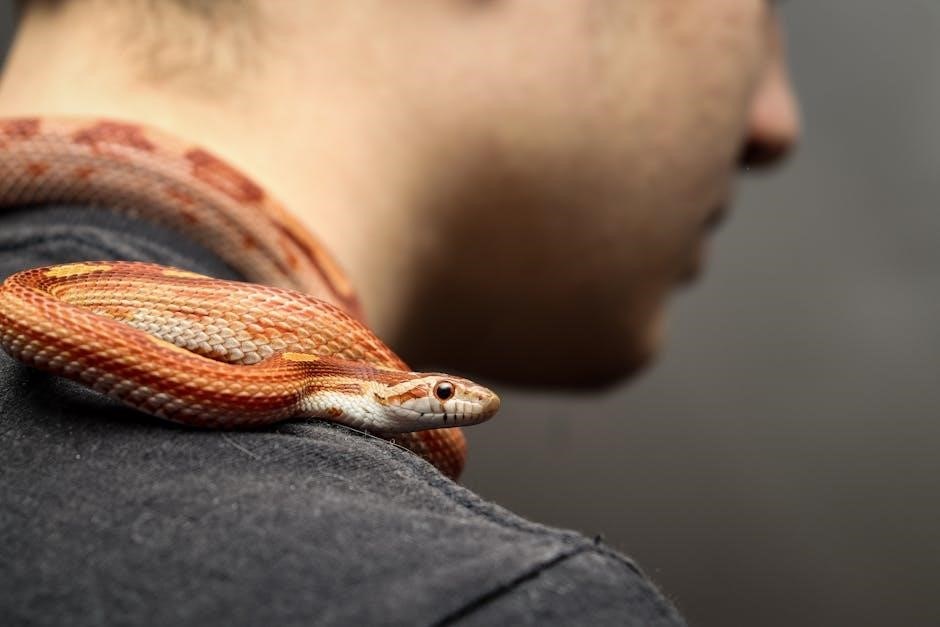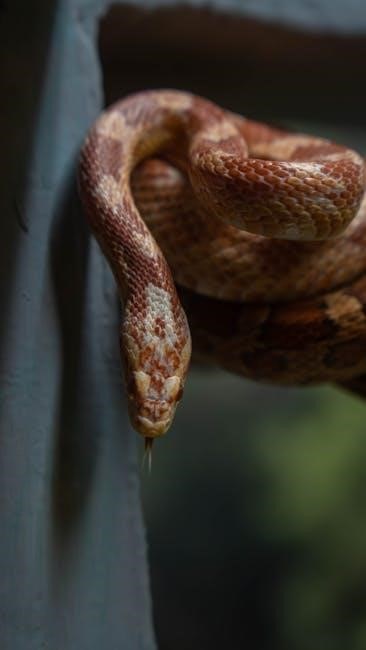 Corn snakes are carnivorous, requiring a diet rich in protein from small mammals. Hatchlings need frequent feeding, while adults eat less often. Prey size should match the snake’s age and girth. Proper hydration is essential, with water always available. A balanced diet ensures growth, energy, and long-term health, avoiding nutritional deficiencies and promoting a thriving pet corn snake.